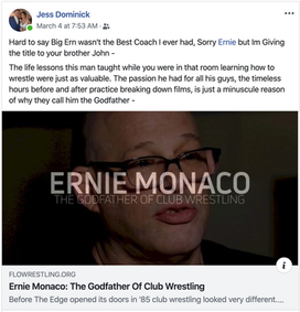 In 2009, Martin Floreani, the founder of FloWrestling, referred to Ernie as "The Godfather" and "The Originator" of club wrestling. This title acknowledges his pioneering role in mainstreaming amateur wrestling as a full-time private wrestling school with The Edge School of Wrestling, established in 1984.